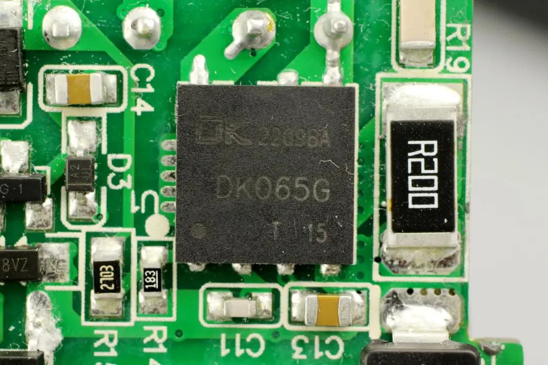 充電器初級主控芯片采用了一顆來自東科的合封氮化鎵芯片DK065G,是一顆內部集成了650V氮化鎵開關管的準諧振反激開關電源功率芯片。DK065G采用谷底開通以降低開關損耗,最高支持250kHz開關頻率,待機功耗低于50mW,采用DFN8*8封裝,適用于PD快充,電源適配器等應用。